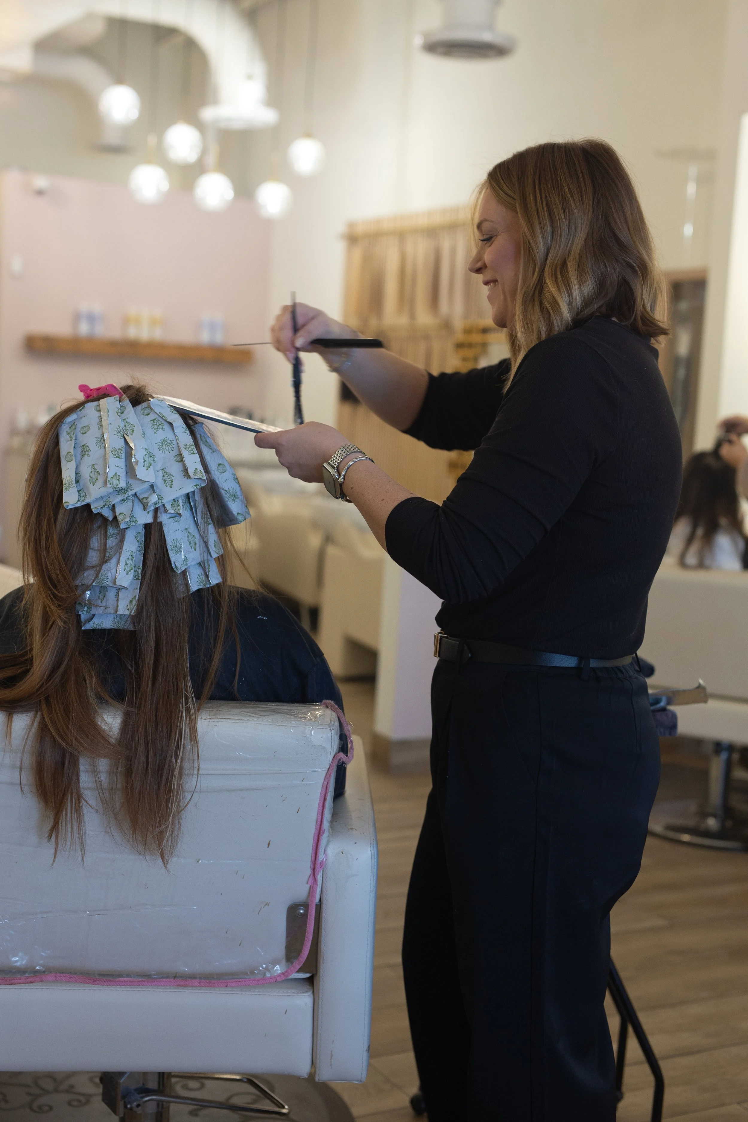 Healthy hair is non-negotiable. We prioritize techniques and products that maintain strength, shine, and overall hair health, so your color looks and feels as beautiful as it appears..